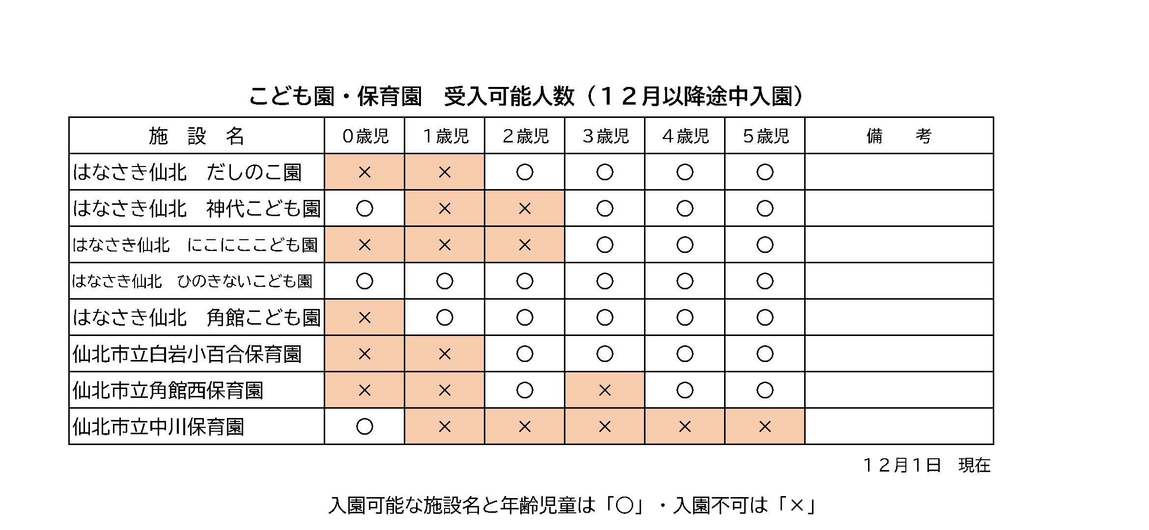 保育園・認定こども園等の受入状況 仙北市内の保育園・認定こども園等の受入状況です。最新の受入状況は、こども家庭センターまでお問い合わせください。 令和7年度(令和7年12月1日時点) 保育園・認定こども園等の受入状況(令和7年12月1日時点)(PDF:67MB) 保育園・認定こども園等の受入状況に関するお問い合わせ こども家庭センター 〒014-0392 秋田県仙北市角館町中菅沢81番地8 電話:0187-43-2280 分野別情報 届出・各種 税 年金・保険 ごみ 防災 医療 心と体の健康 高齢者 障害者福祉 子育て 生活・住まい 教育 生涯学習・スポーツ 仕事 産業 選挙 目的別情報 目的別情報一覧