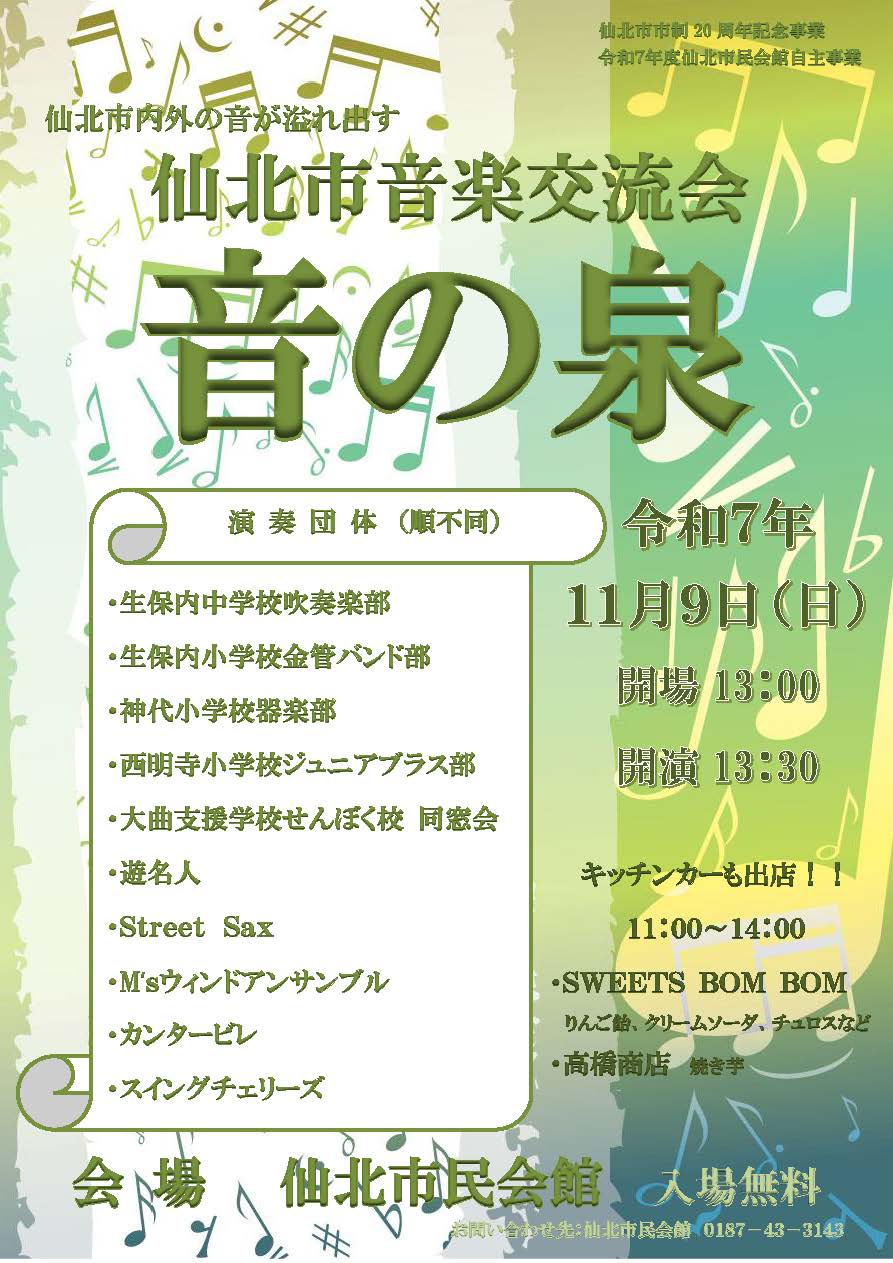 11/9(日)に市内学校の吹奏楽部や音楽団体が集うイベント、仙北市音楽交流会『音の泉』を開催いたします。