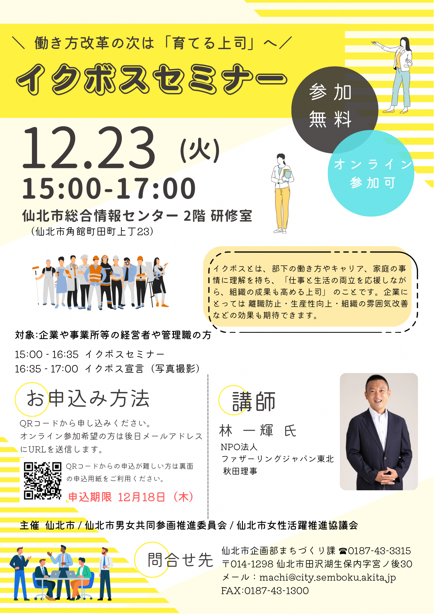 仕事と家庭の両立を応援する「イクボス」をテーマにしたセミナーを開催します。企業や団体等の経営者や管理職の方はもちろん、興味のある方ならどなたでも参加できます。