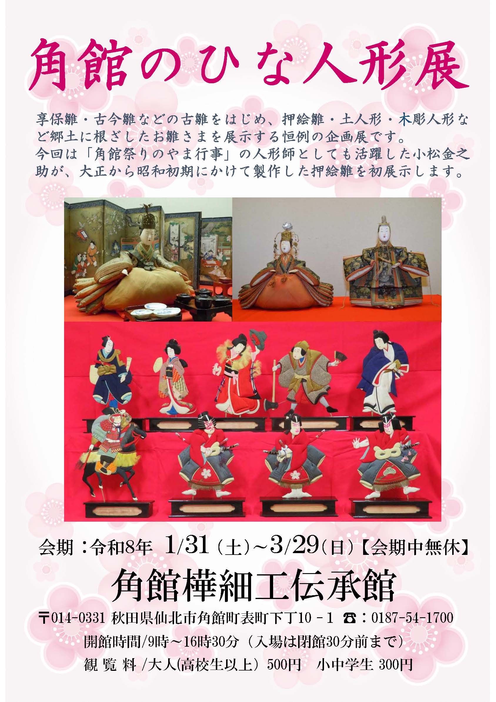 角館樺細工伝承館では1月31日より、「角館のひな人形展」を開催しています。享保雛・古今雛などの古雛をはじめ、押絵雛・土人形・木彫人形など郷土に根ざしたお雛さまを展示する恒例の企画展です。