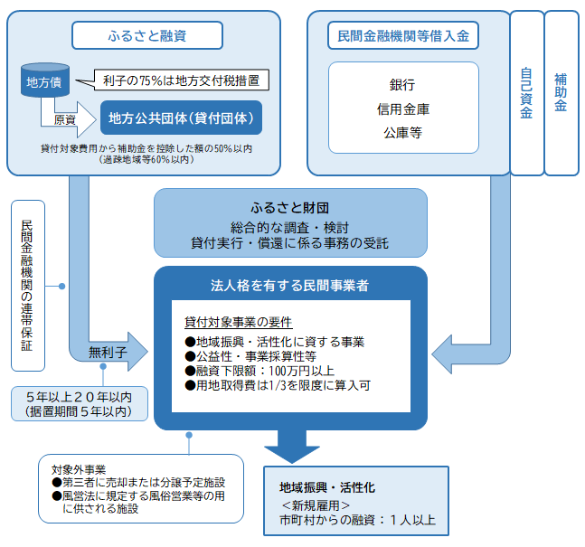 地域総合整備資金貸付(ふるさと融資)は、地方公共団体が民間金融機関等と共同して地域振興に資する民間事業活動等を支援し、活力と魅力ある地域づくりの推進に寄与するために、一般財団法人地域総合整備財団(ふるさと財団)の協力を得て、民間事業者等の設備投資に係る無利子資金の貸付を行う制度です。ぜひご活用ください。