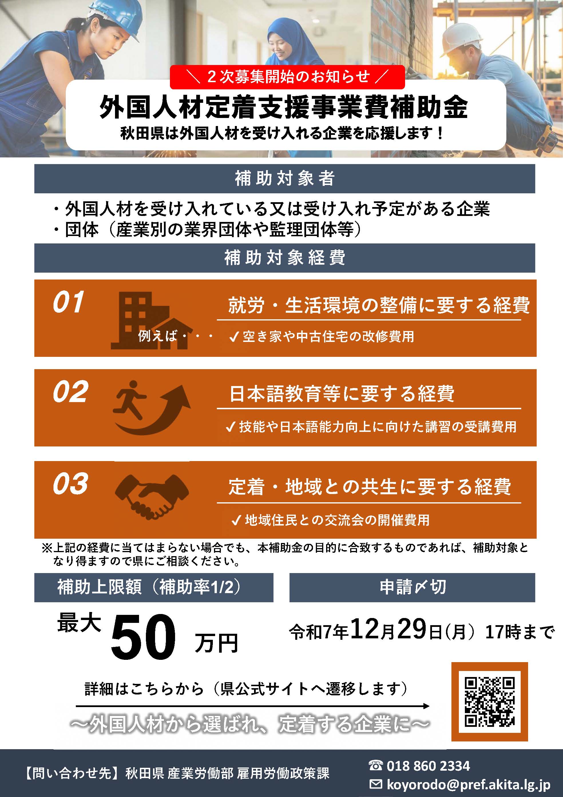 【二次募集】 秋田県外国人材定着支援事業費補助金の募集について