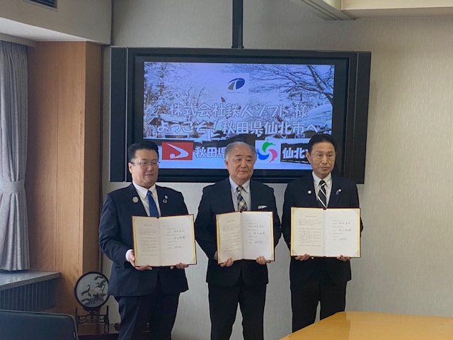(左から、田口市長、杉澤 芳富 代表取締役、神部秋田県副知事)