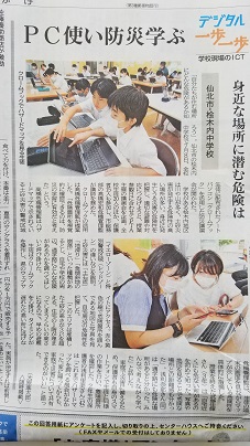 7月に実施した親子防災教室の様子が、先週金曜日に秋田魁新報に掲載されました(写真)。本校は地域の地理的条件を考慮し、これまでも防災教育に力を入れてきていますが、今回は一人一人がパソコンで自宅周辺や通学路の危険個所を最新のハザードマップで確認しました。また、保護者の方々にはお持ちのスマートフォンを使って確認していただきました。親子で実施したことにより、家庭内での話し合いにつながったものと考えています。