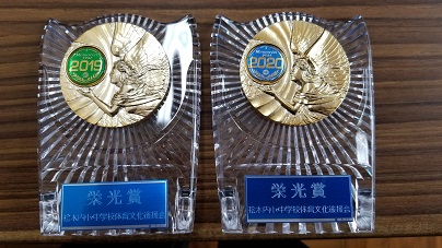 本日は、昨年度から延期していた地域大運動会開催日でした。しかし、新型コロナウイルス感染症拡大防止のため昨年に引き続き2年連続での開催見送りとなりました。残念です。この運動会では開会式において、前年度体育文化面で顕著な活躍をした児童生徒に体文栄光賞を表彰することにしていました。昨年度も開催しなかったため2年分の表彰ができていません。このため、現中学校在籍者に対して令和元・2年度分を本日表彰しました。すでに中学校を卒業している該当者には盾をお届けしております。来年度こそは、盛大に運動会、そして表彰式を行いたいものです。
