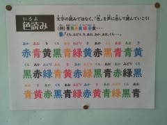 10月の保健室前廊下の掲示が、「めをたいせつにしよう」にリニューアルしました。今回の掲示では、「ビジョントレーニング」という「見る力」をつけるためのトレーニングができます。例えば、写真のように、漢字で色が書かれていますが、文字を読むのではなく、その字が何色で書かれているかを読まなくてはなりません。意外と難しいです。他にも、目だけでゴールを目指す「線迷路」など、様々なトレーニングがありますので、ぜひ、チャレンジしてみてください。