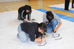今日、4回目の紙風船制作に取り組みました。今回は、4〜6年生がデザインの墨書きを行いました。デザインの輪郭を太めの筆でなぞったり、全校児童の名前を力強く書いたりしました。写真では分かりにくいかもしれませんが、デザインも文字もけっこうな大きさがあるので、かなりの労力がいります。そして、失敗の許されない一発勝負!体育館は、緊張感に包まれました。一晩乾かし、明日は、いよいよ全校児童による彩色です。