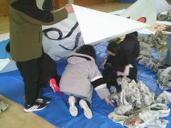 金曜日、無事に彩色作業を終えましたが、紙に塗った塗料を乾かすために、くしゃくしゃにした新聞紙を紙の下に敷き、床との間に空間を作っておきました。今日は、5・6年生がその新聞紙を取り除き、しわを伸ばして畳むという作業を行いました。冷蔵庫のような体育館での作業は、とても大変だったのですが、黙々と作業に取り組み、予想よりもかなり早く作業を終えることができました。でも、手が冷たくて冷たくて・・・。本当によく頑張りました。4枚の絵を順番通りに並び替え、明日は、いよいよ完成へと向かいます。二つのテレビ局の取材を受ける予定です。