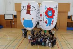 昨日は、紙風船の組み立て作業を行いました。はじめに、4枚の絵と頭の部分を貼り合わせました。そして、本体に口輪(風船底部の竹の輪)を付けて完成です。上桧木内紙風船上げ保存委員会の副会長さん2名に丁寧に指導していただきながら、みんなで協力して作業を進め、ついに、桧木内小学校の紙風船が完成しました(写真)。開催が心配された上桧木内の紙風船上げですが、2月10日(火)夕方5時頃、本校の紙風船は、上桧木内の空にゆらゆらと舞い上がる予定です。寒ければ寒いほど、空高くきれいに上がるということでしたので、当日のお天気に期待しているところです。