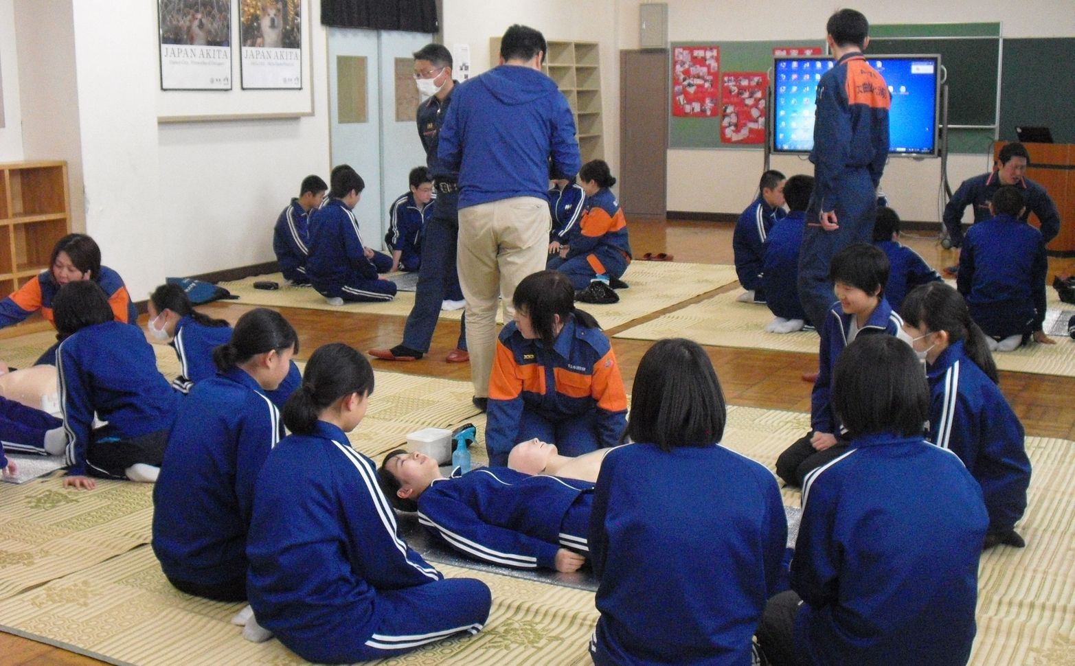 大曲仙北広域市町村圏組合角館消防署田沢湖分署員の方々が、2年生30名に救急救命講習が行われました。胸骨圧迫とAEDの使用法を中心とした救命処置の練習を行い、いざというとき、一人一人が救命できるようになりました。