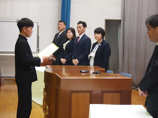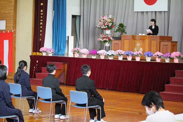 新任式では、新たに着任した職員の紹介や挨拶がありました。生徒の司会による柔らかな進行で、代表生徒から温かな歓迎の言葉や学校の紹介があり、これからの学校生活への希望がふくらむ式となりました。