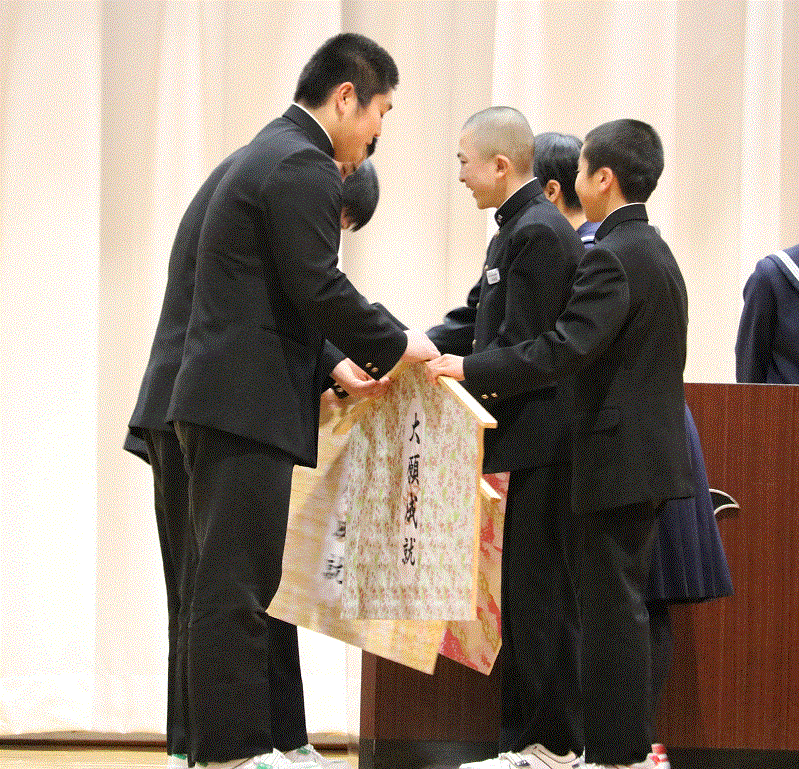本日、冬休み集会が行われました。各学年の代表生徒の作文発表や校長先生のお話などがありました。集会の最後には、1・2年生から受験勉強を頑張っている3年生の全員合格を願い、手作りの絵馬が贈られました。