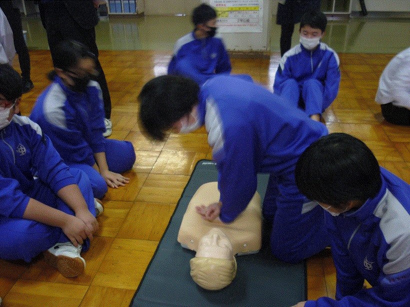 角館消防署から6名の署員をお迎えして、救急救命講習会が行われました。はじめに救急救命に関するお話を署員の方から聞いた後、12班に分かれて人形を使った実習を行いました。署員の方からアドバイスをもらいながら、全員が熱心に取り組みました。