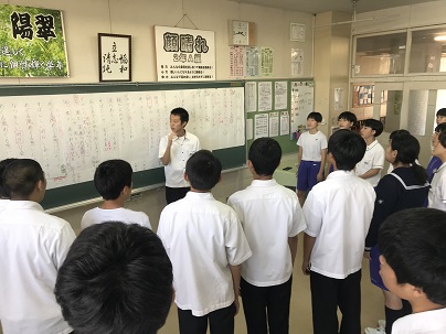集会には、お祭りに参加する全18丁内の責任者・少年係等の役員の方々からご来校をいただきました。生徒は、参加する丁内ごとに分かれ、事故のない安全で楽しいお祭りにするための「中学生に期待される役割・参加のマナー・約束等」を確認しました。