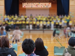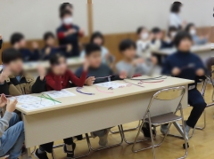 午後から来年度入学する1年生の体験入学が行われました。保護者説明会が行われている間、5年生がグループごとに新入生と学校探検に出かけ、クイズを出すなどしながら案内してまわりました。その後、体育館で「だるまさんが転んだ」などのゲームをして交流しました。新入生は4月が待ち遠しくなったのではないでしょうか。