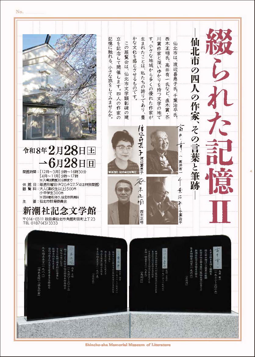 新潮社記念文学館 【令和8年2月28日(土)〜令和8年6月28日(日)】 角館町と新潮社 利用案内 展示案内 企画展 名誉館長 お問い合わせ 仙北市新潮社記念文学館 電話:0187-43-3333 FAX:0187-53-2701 交通アクセス JR角館駅より徒歩10分 当施設までのアクセスはよぶのる角館をご利用ください。 公共文化施設にもどる アクセス 交通案内 イベント情報 イベント情報一覧 観光スポット エリアから選ぶ 八幡平・玉川 乳頭 田沢湖高原・水沢・駒ヶ岳 田沢湖 抱返り・神代・白岩 西木 角館 季節のおすすめ 季節別一覧 宿泊施設 エリア別 キャンプ場 物産・味処 エリア別 学習旅行支援 学習体験新書 ご案内 公共文化施設 ライブカメラ リンク